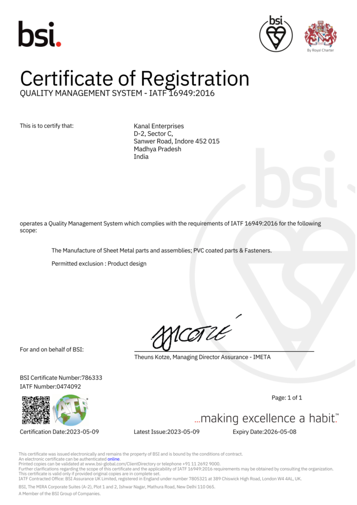 KANAL ENTERPISES has earned a number of prestigious certifications because of its efficiencies. They are an ISO/TS 16949:2002, ISO 9001:2008 certified organization. All products are manufactured confirming to DIN, JIS, IS, BS, ANSI, IFI and ISO standards. KANAL ENTERPISES believes in continuously upgrading ourselves to enhance the quality keeping abreast with the changing trends.
